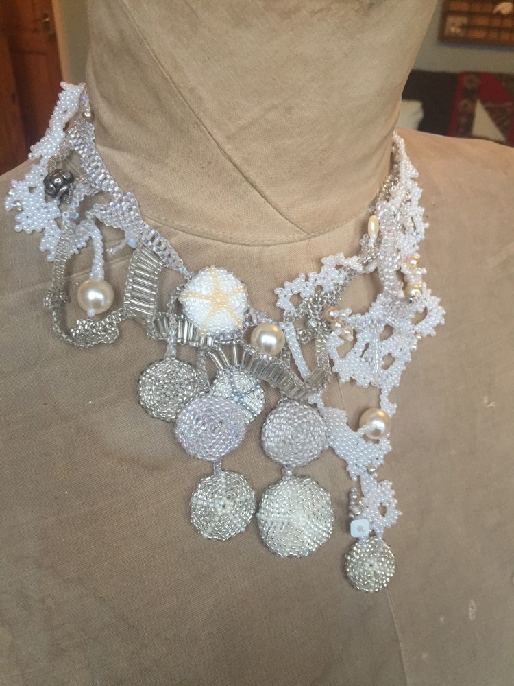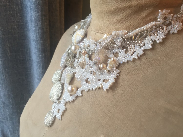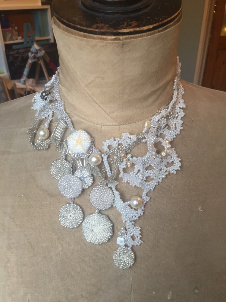 Statement necklace worked in peyote stitch with signature sea urchin elements. Asymmetric with lots of movement. Looks amazing against skin. Bold style in a muted colour palette making this big piece surprisingly easy to wear.