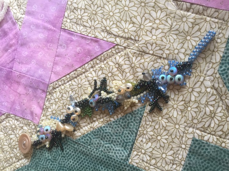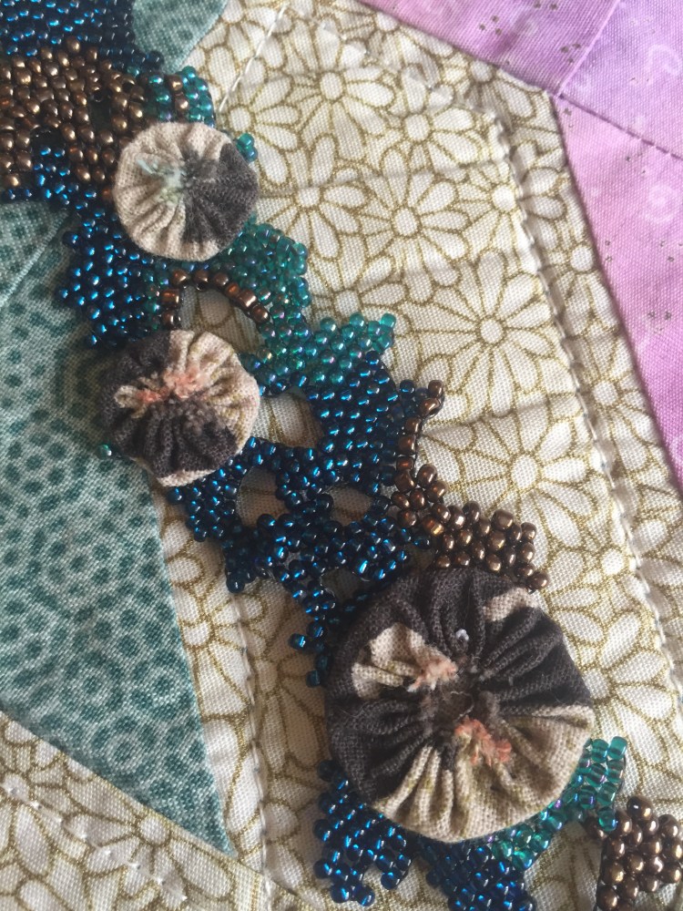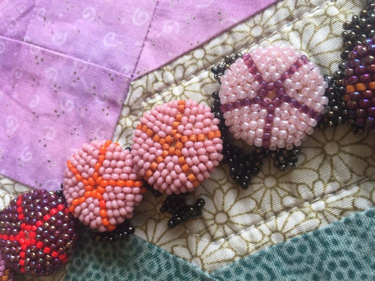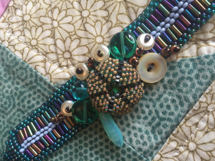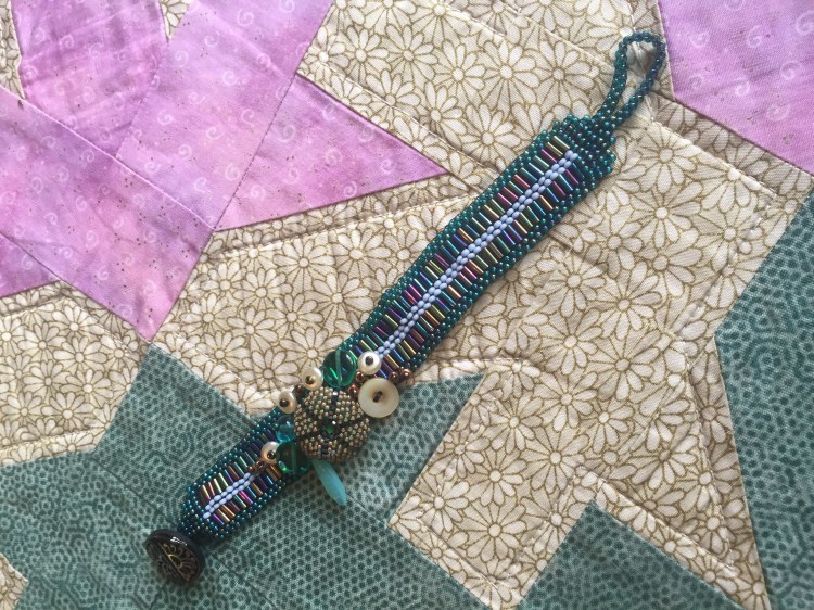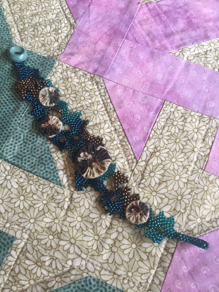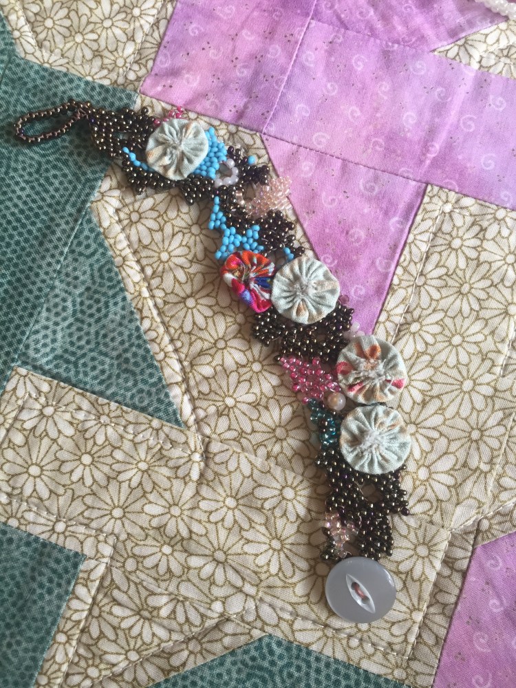 Cluster of fabric sea anemones on a flat woven freeform strap bracelet.