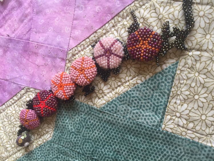 A chunky row of pink and purple sea urchins on a strip of seaweed to form a comfortable bracelet.
