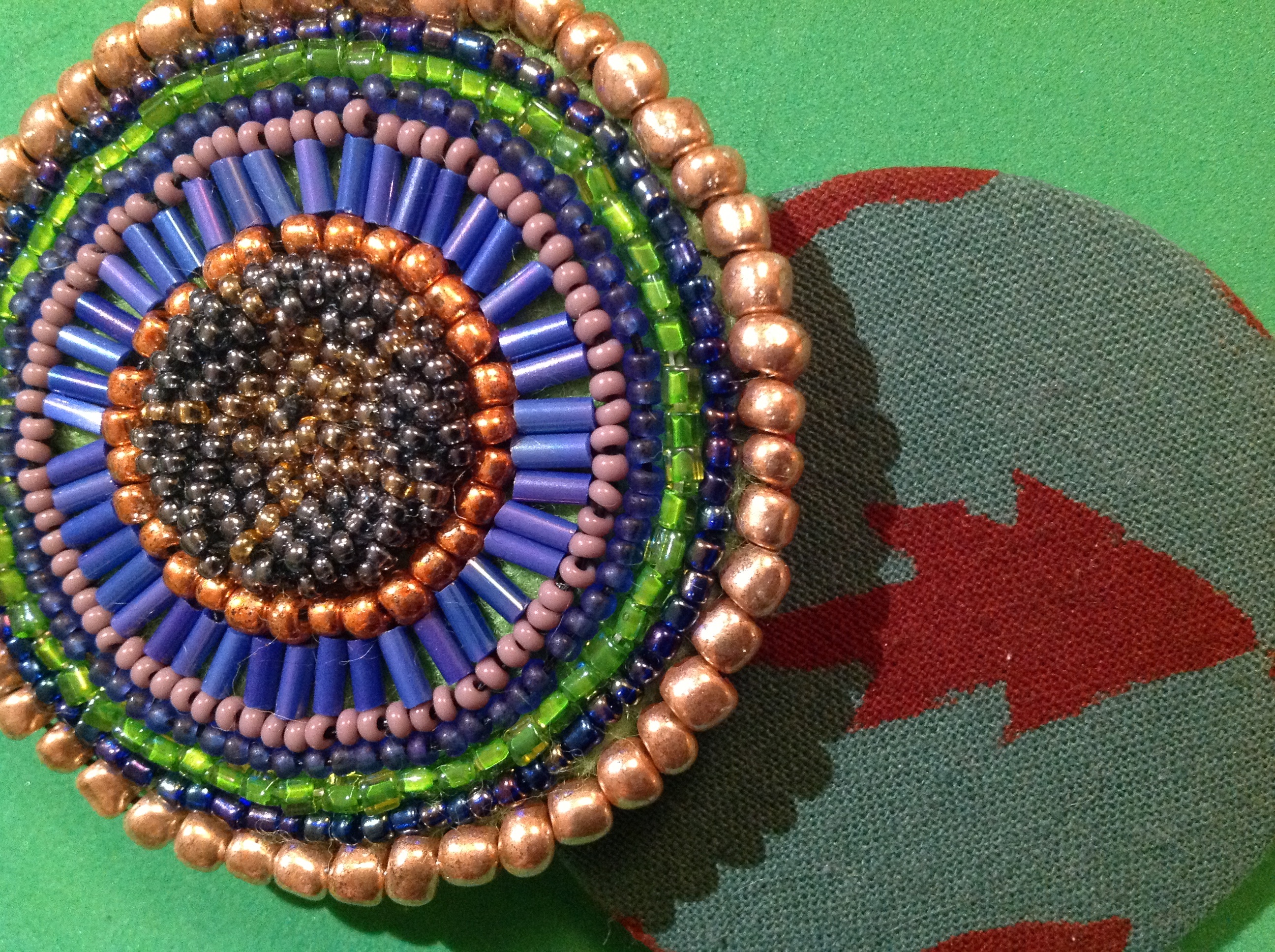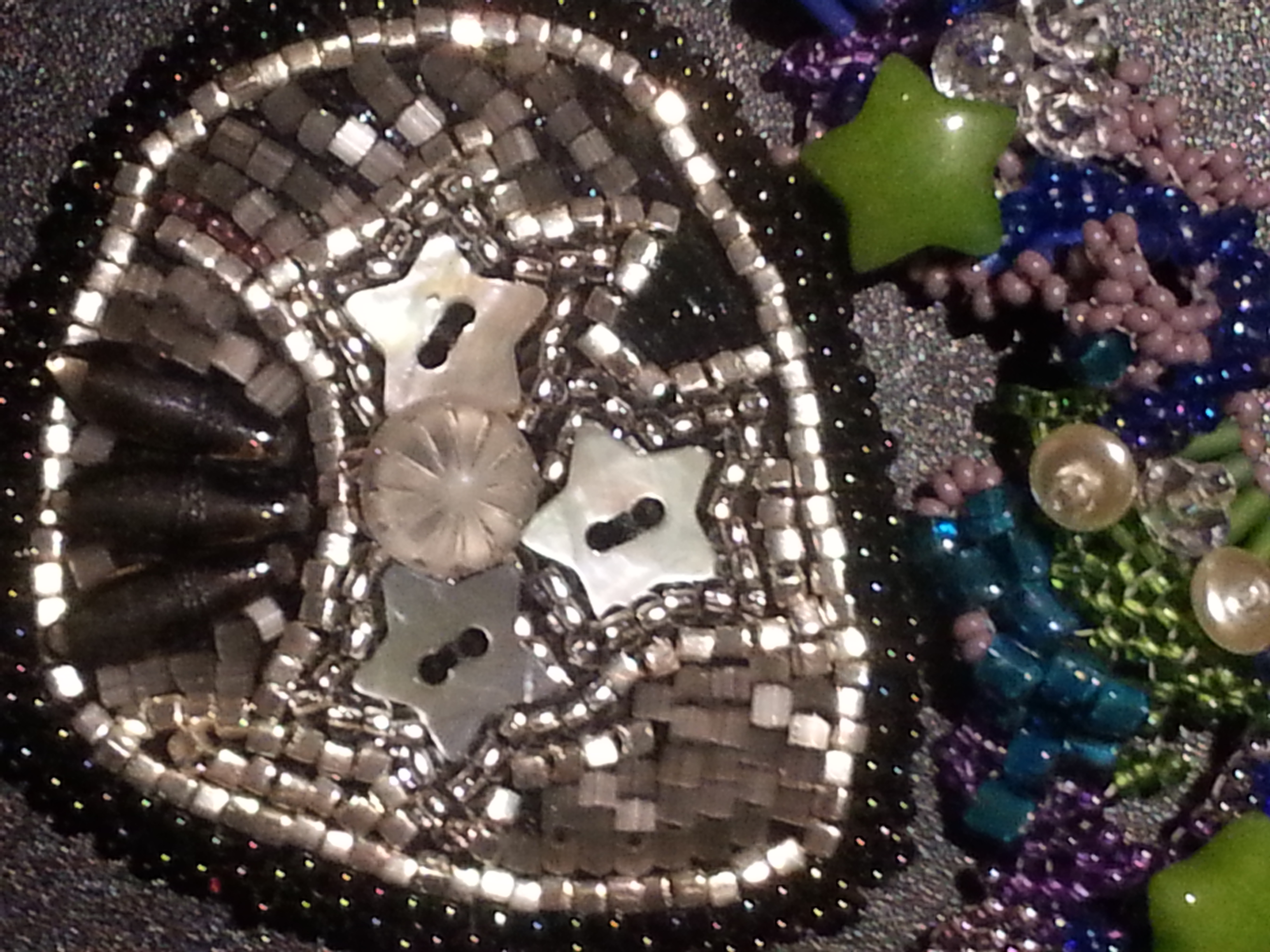 First attempt at realising a necklace that has existed only as a sketch for years. Aquila is a 3 star constellation which contains a star called Altair. This piece of bead embroidery will form the off-centre of the necklace. I think I will try the centre piece again before working on the neckpiece, this first attempt is chunkier that I envisioned. I’ll put a lovely back on this piece and convert it into a brooch.