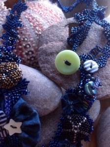The first is this navy blue necklace. I found the making very satisfying. I have a stack of suffolk puffs as these are something I like to make unthinkingly in the evening. They are nice elements to be incorporated along with my sea urchins and I really enjoyed putting this piece together. I usually make bracelets as these are quicker and more popular but I enjoy taking the time to make necklace. Necklaces take longer and are a bit more challenging.