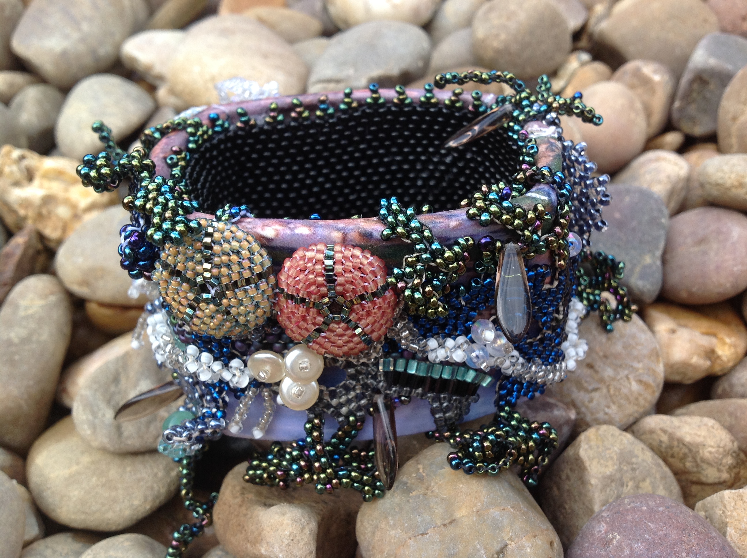The bangle is an example of something new I’ve been developing. I’ve always enjoyed photography and I’ve been trying to find a way to combine the two and three dimensional this is the first step along the way. I need to work on the proportion of photograph and beadwork but I’m happy with this first step along the way.