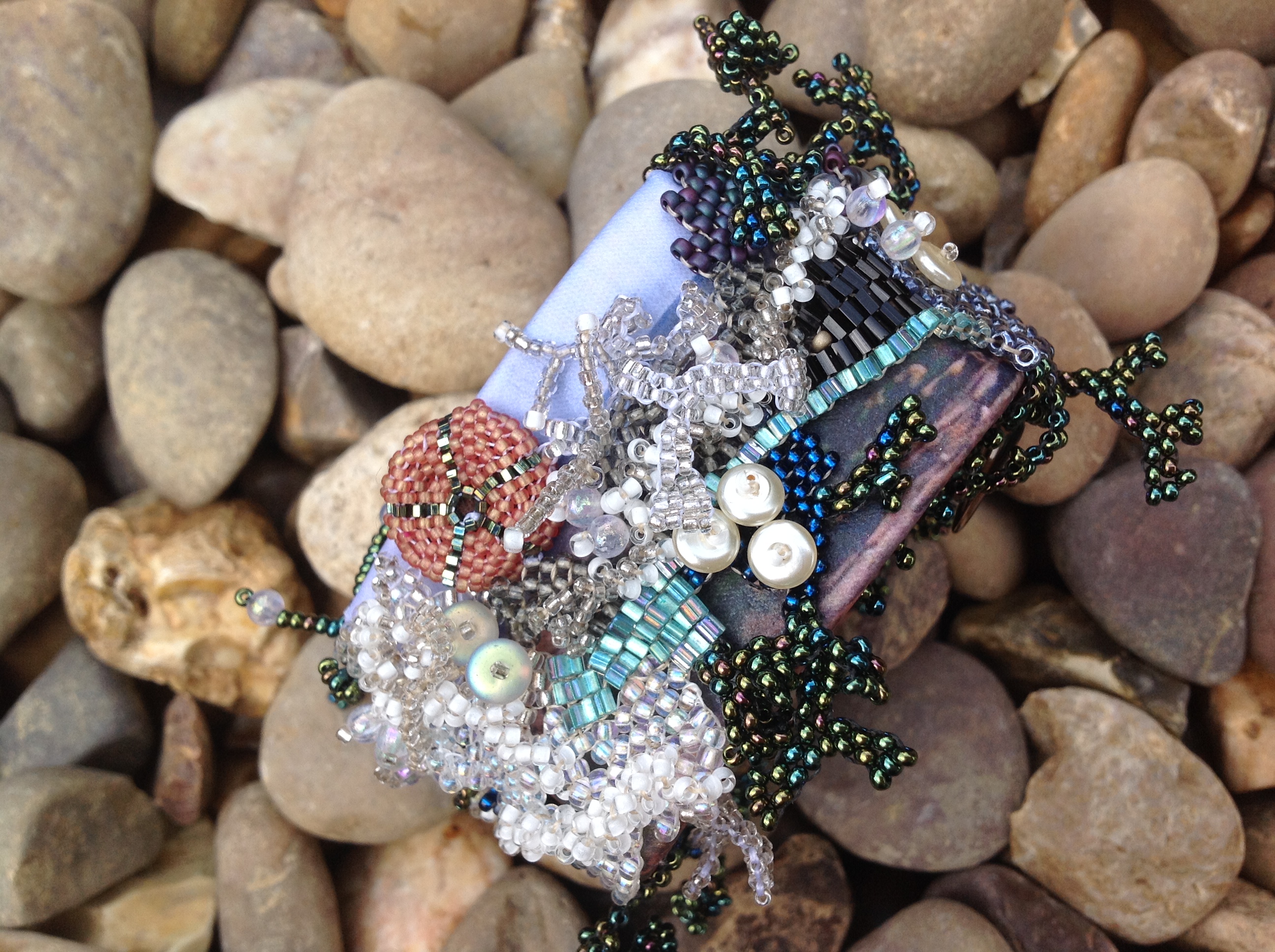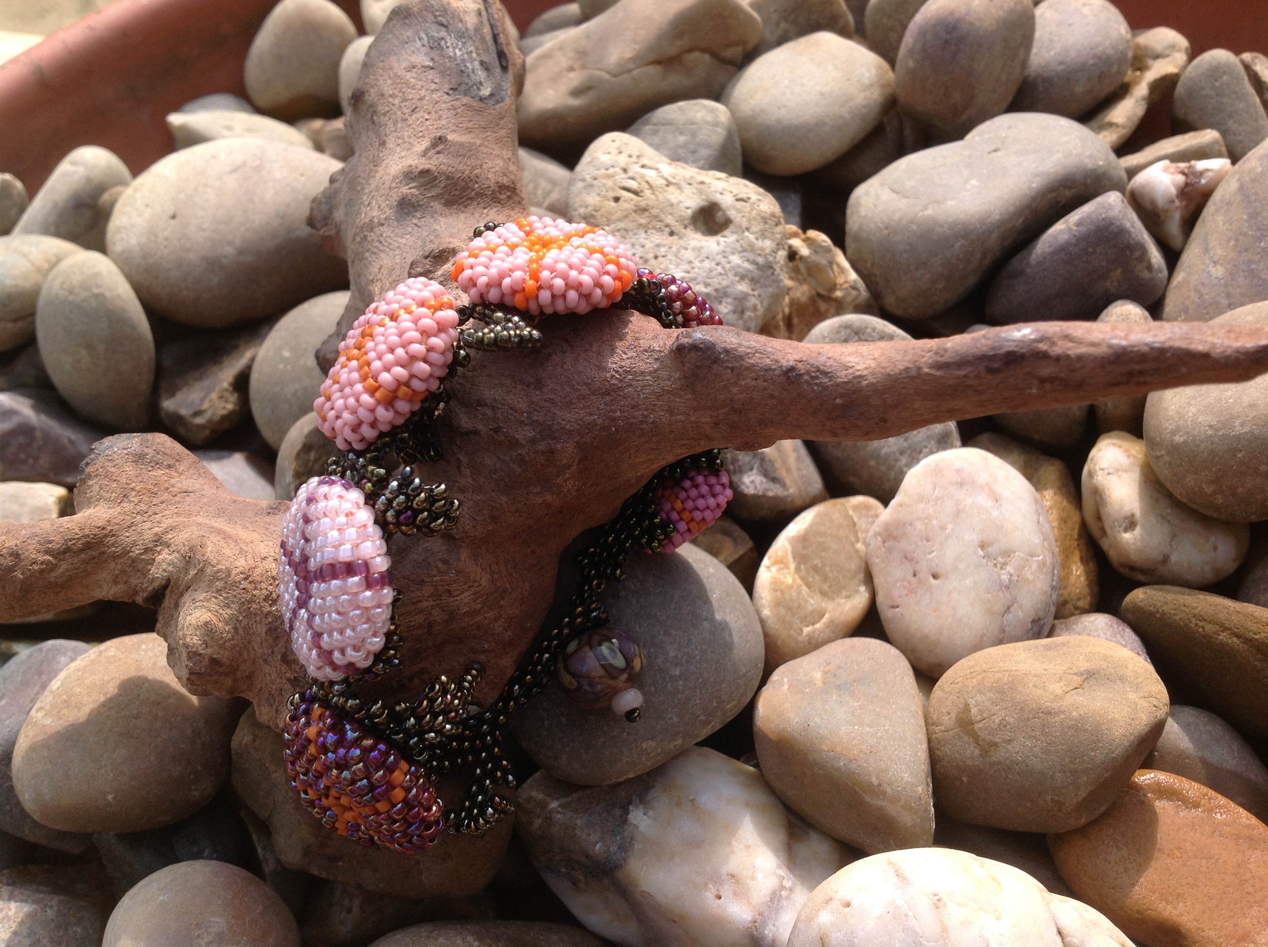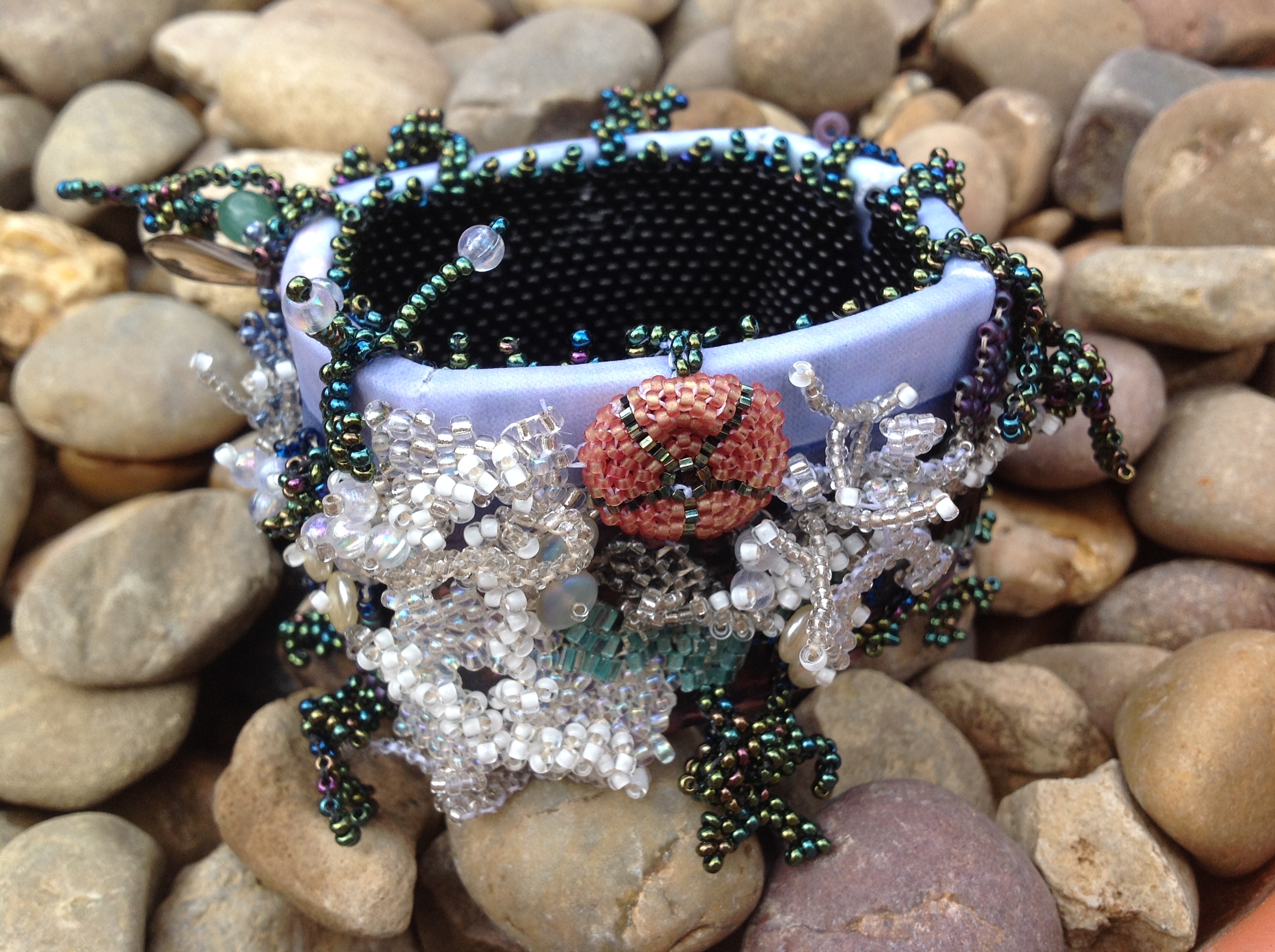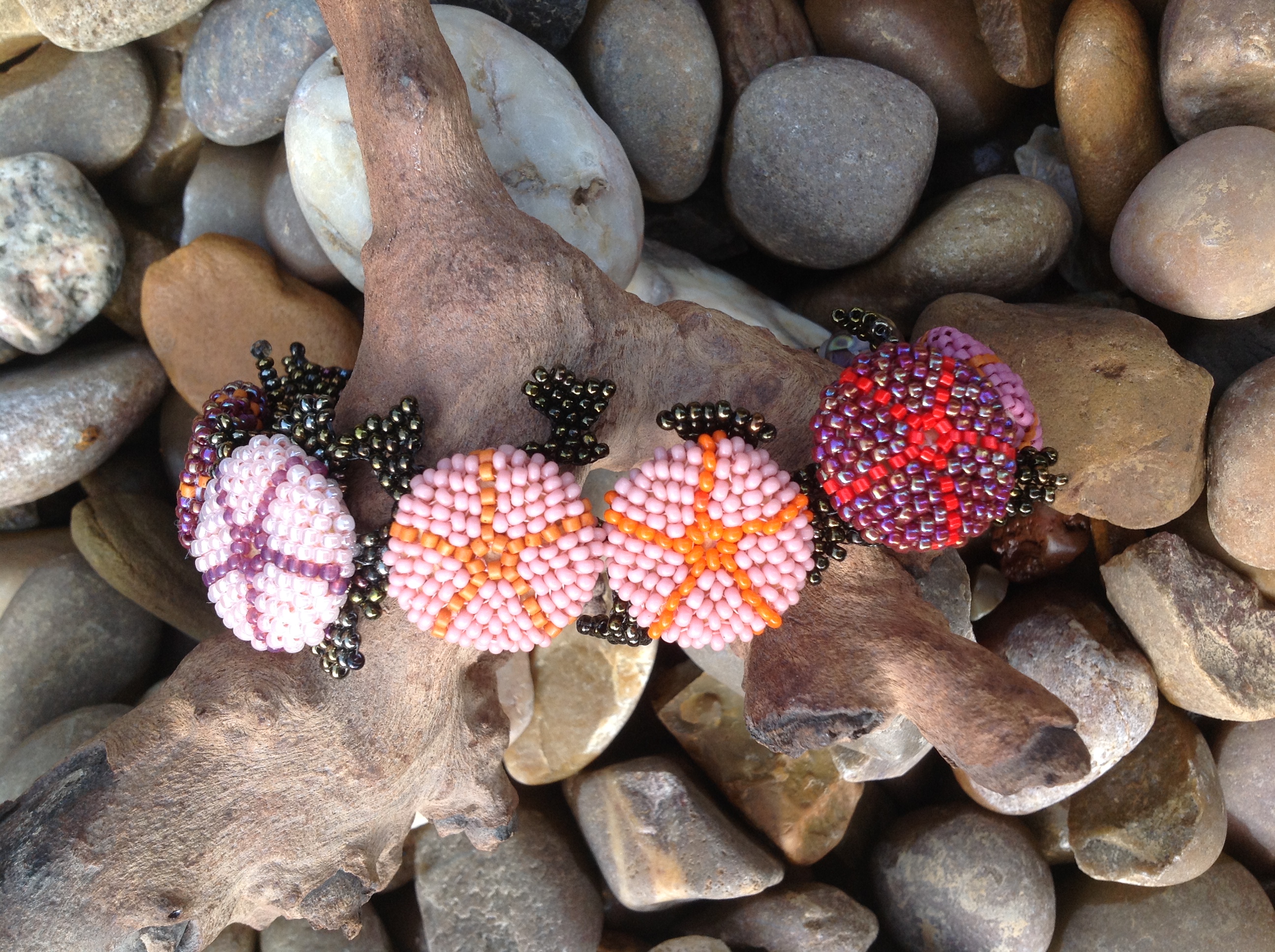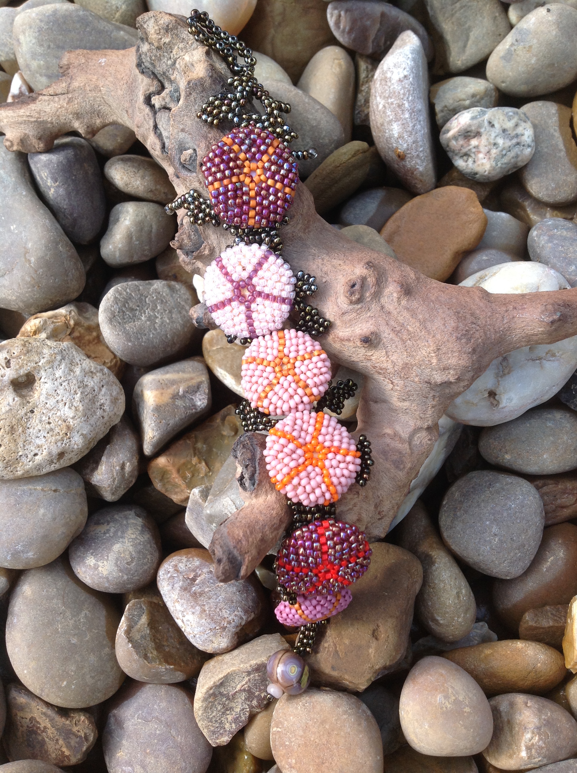 This is the third in a series of these bracelets. One is owned by a friend in Edinburgh, the other is in the US. Each one is unique but this one is special as the closure is a lampwork bead made by a beading friend. It’s quite a chunky piece which is lovely on special occasions. I have been experimenting with a more slim line sea urchin element so the next in this series will be a little more low profile.